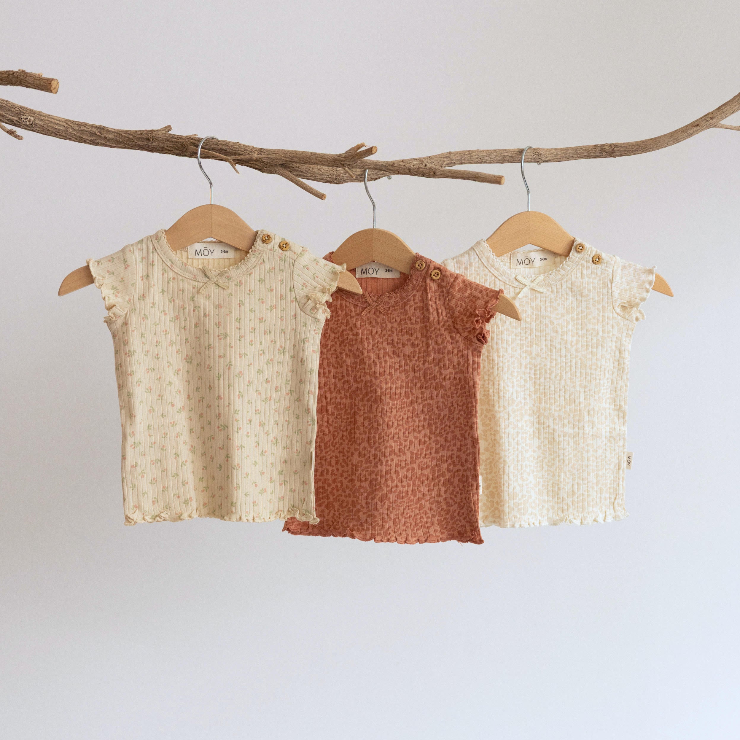 החולצות עשויות בד כותנה אורגנית רכה וסופר נעימה, גימורי המכפלות מסתיימים בסילסול מעודן ומפתח הצוואר מעוטר ברקמת קרושה בצבע הבד ופפיון קטנטן.