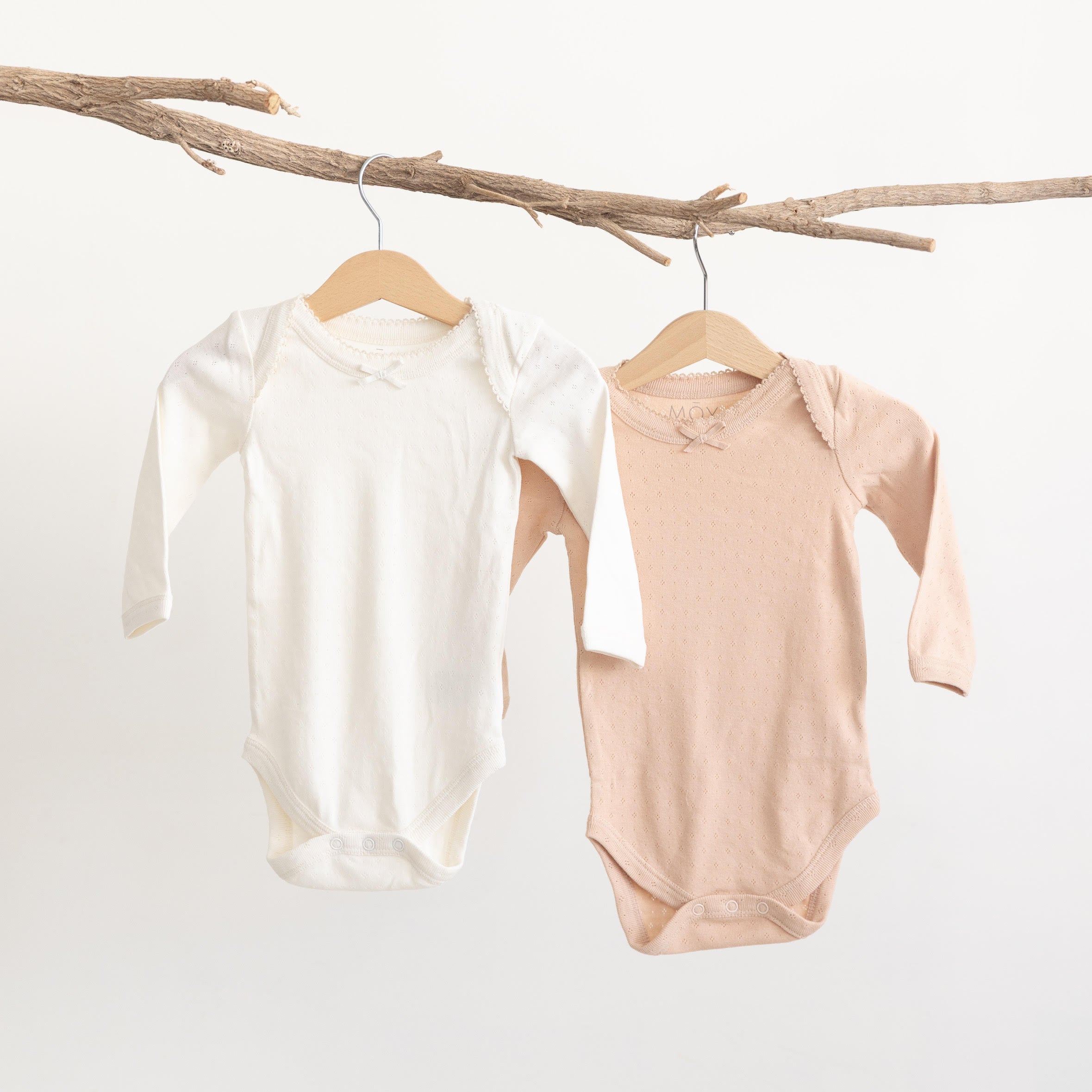 בגדי גוף בשרוול ארוך, סרוגים בבד פוינטל בחירור עדין, נוחים מאד ללבישה, שומרים על בטן הקטנטים עטופה גם בזמן תנועה, ובעלי תיקתקים במפשעה להחלפת חיתול פשוטה. מפתח הצוואר מעטור ברקמת קרושה עדינה בצבע הבד ופפיון קטנטן.(.