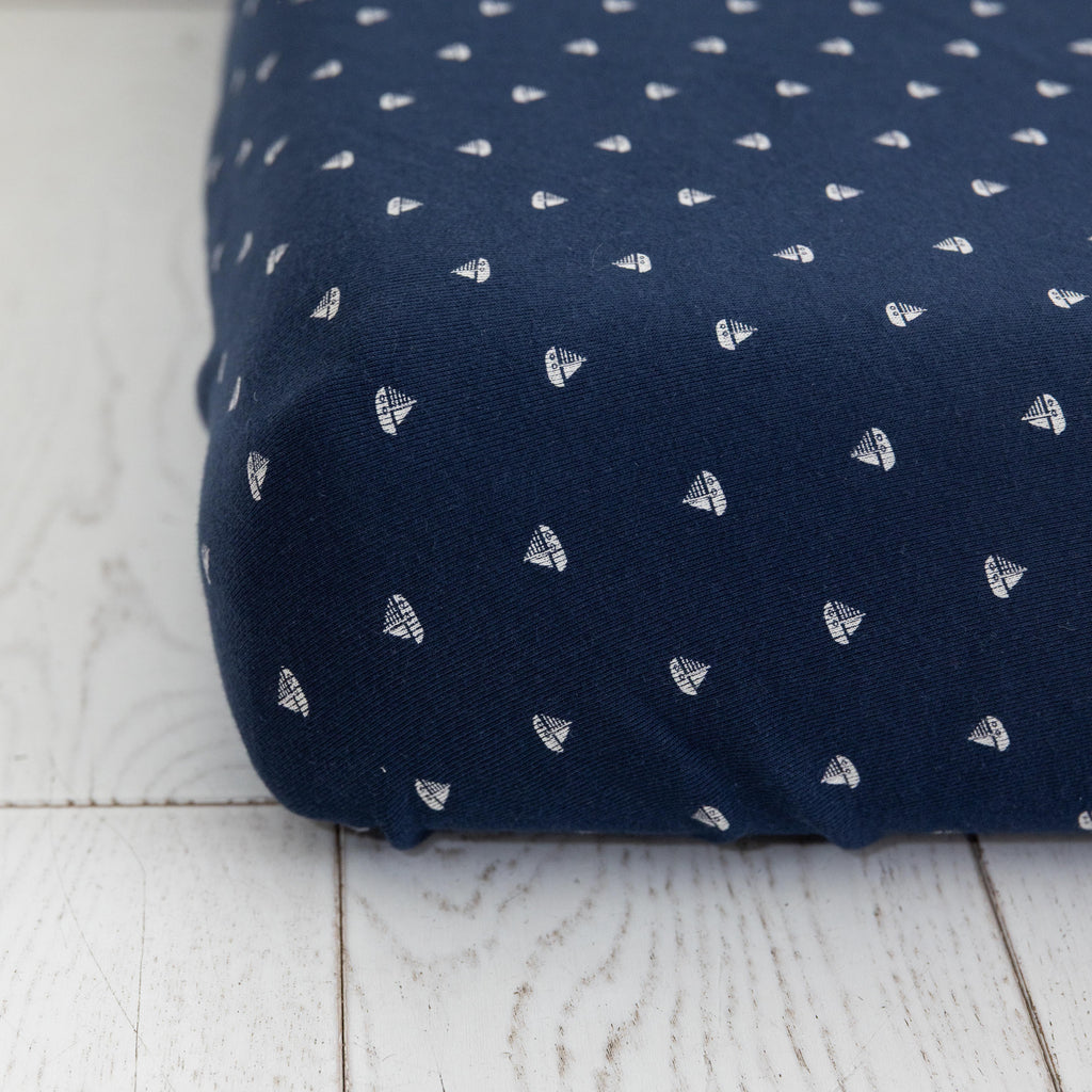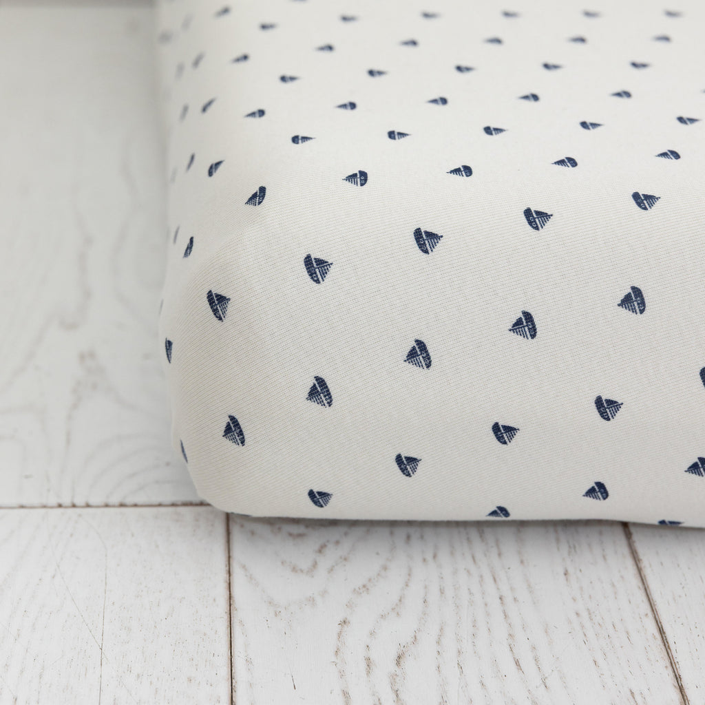 סדינים מכותנה אורגנית איכותית, מודפסים באלמנטים של סירות קטנות.