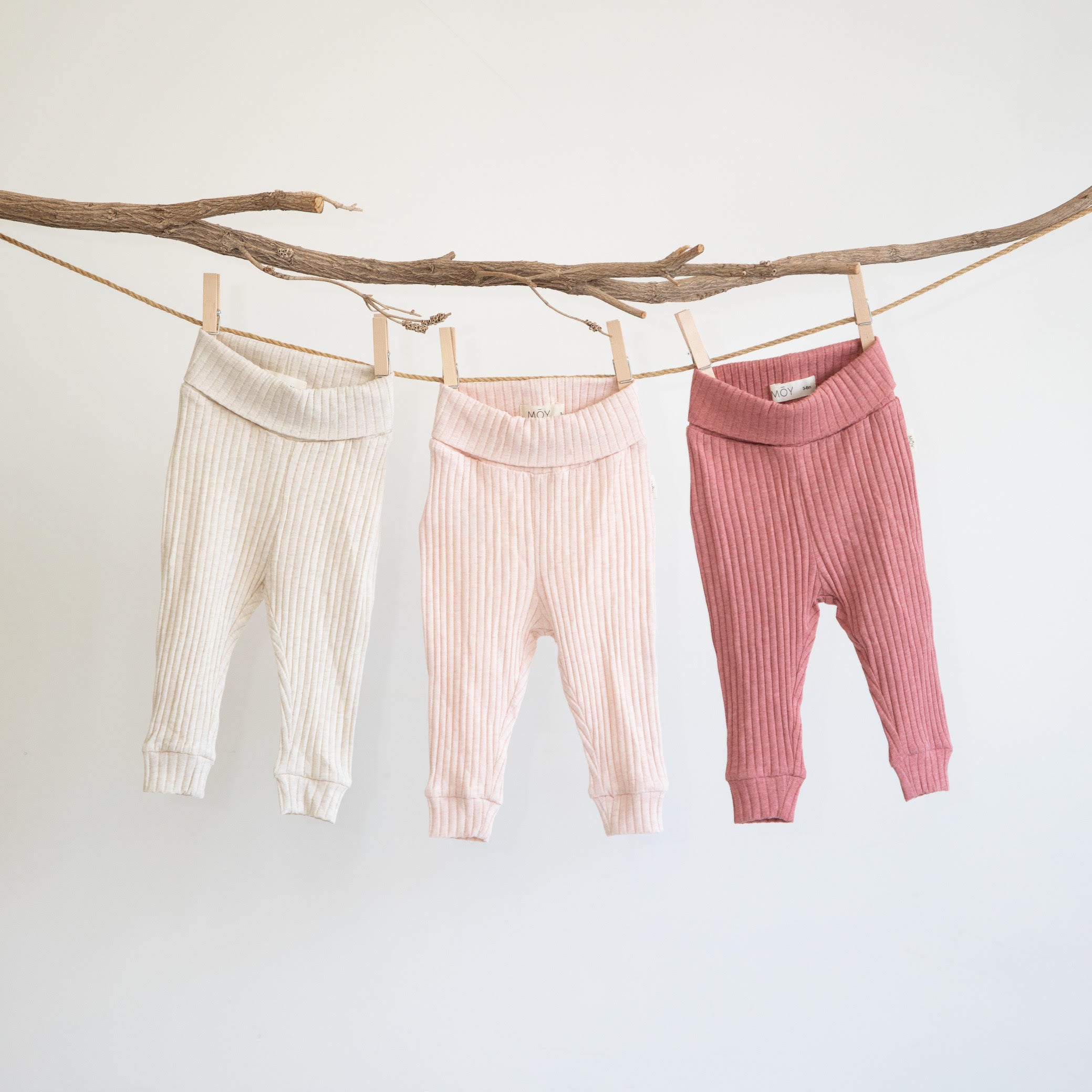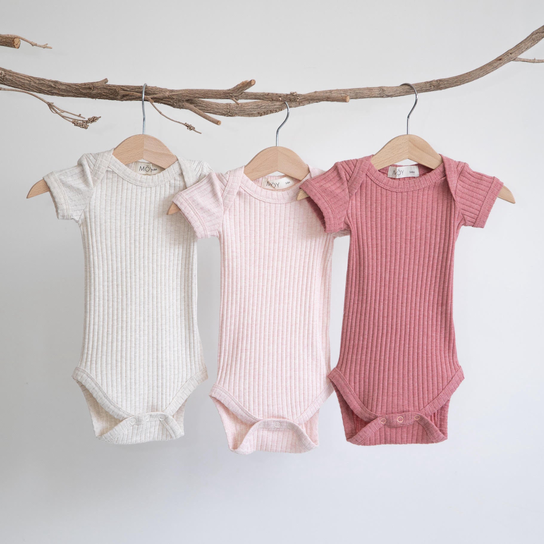 שלישיית בגדי גוף עשויים בד ריב בגווני חום מלאנג׳ המשלב חוטי אלסטן עדינים בסריגתו, בעלי תיקתקים במפשעה להחלפת חיתול פשוטה.