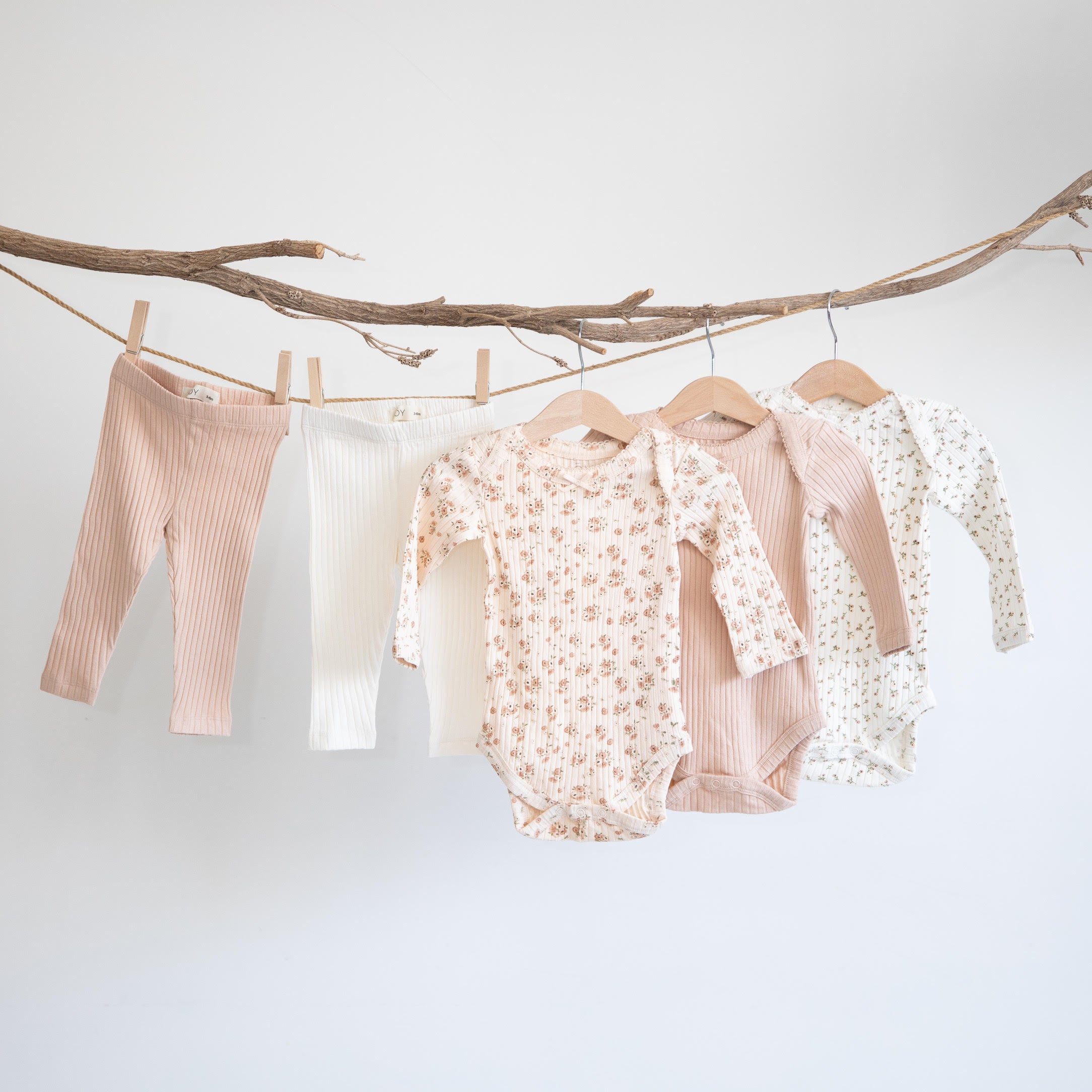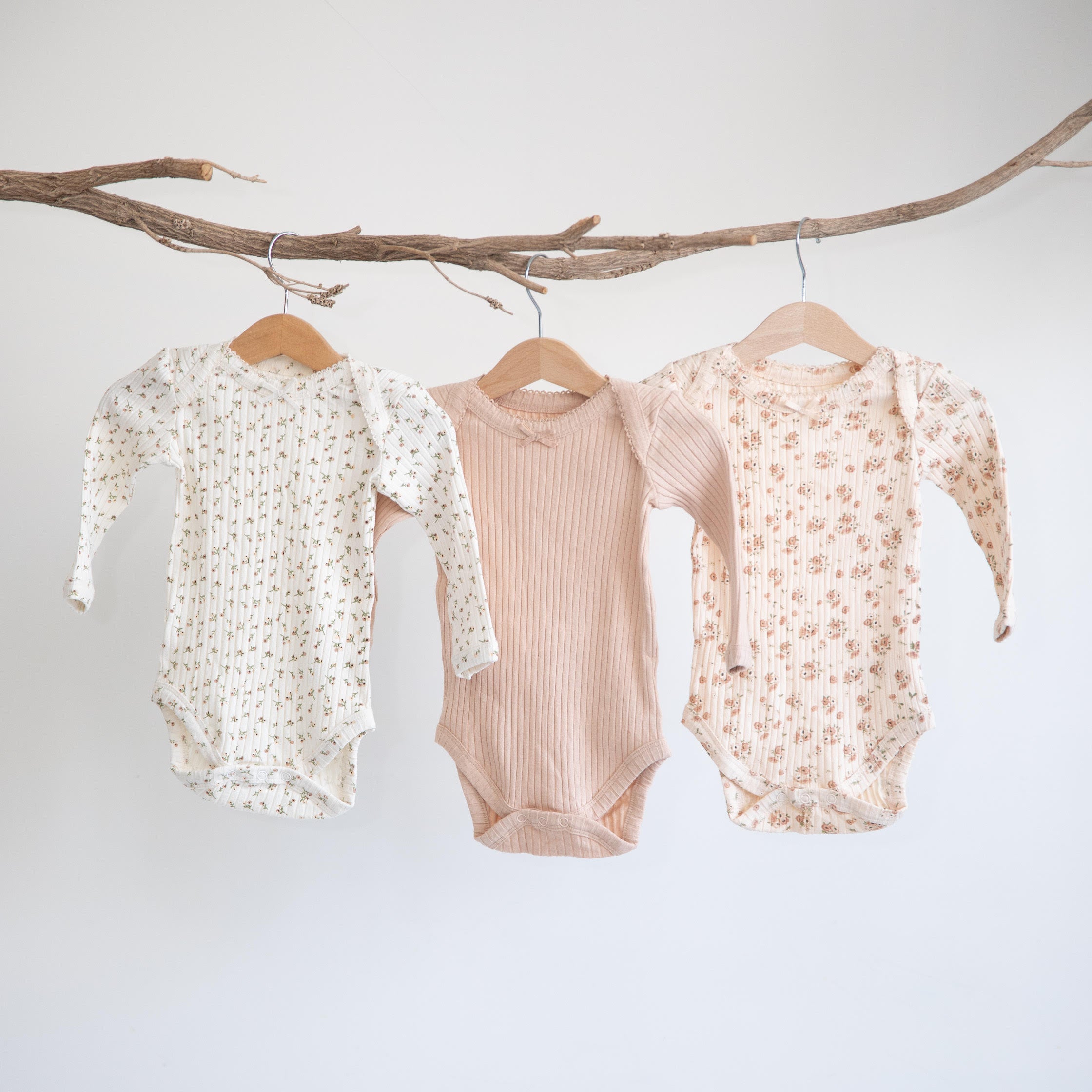 בגדי הגוף עם תיקתקים במפשעה להחלפת חיתול פשוטה עשויים כותנה אורגנית בטקסטורת ריב שטוח.את המחשוף מעטרת רקמת קרושה עדינה ופפיון קטן ממוקם מלפנים(שני בגדי גוף מודפסים ואחד חלק). הרכב בד : 100% כותנה אורגנית.