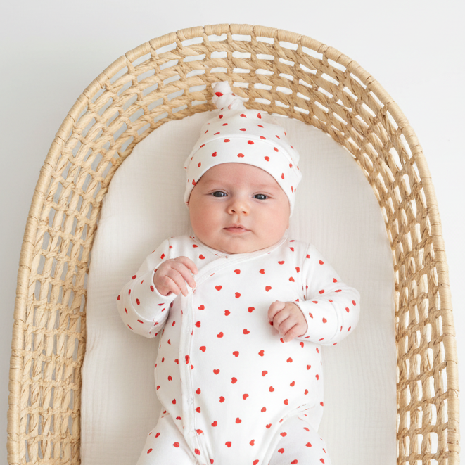 בד כותנה אורגני איכותי, מודפס בלבבות. גזרת בגד הגוף בנויה כמעטפת ומאפשרת הלבשה ללא מעבר הראש בבגד. בקצה השרוולים ישנם חפתים מתקפלים המשמשים ככפפות הגנה משריטות לפני גזירת ציפורניים ראשונית של התינוק. הרכב בד: 100% כותנה אורגנית
