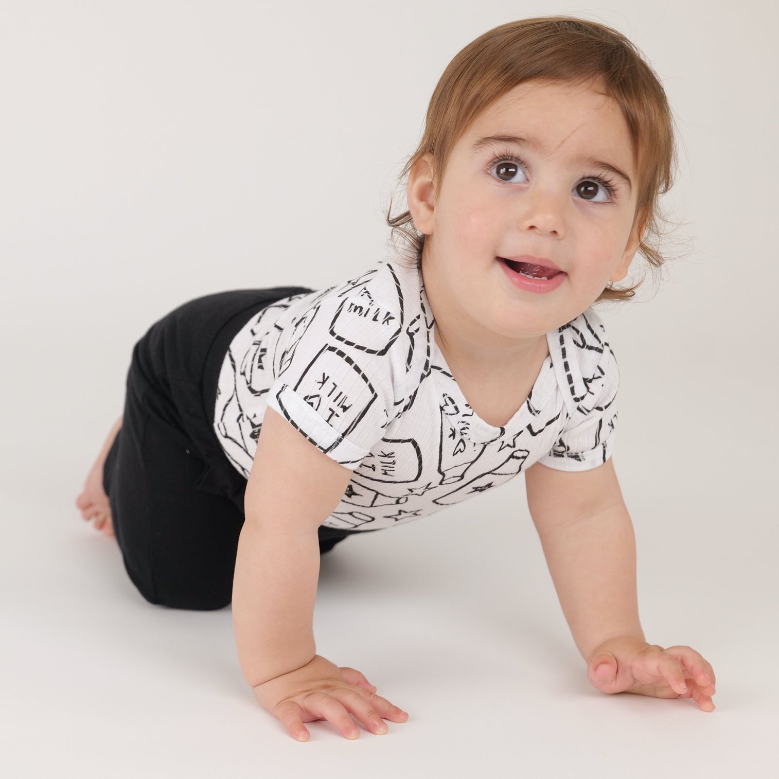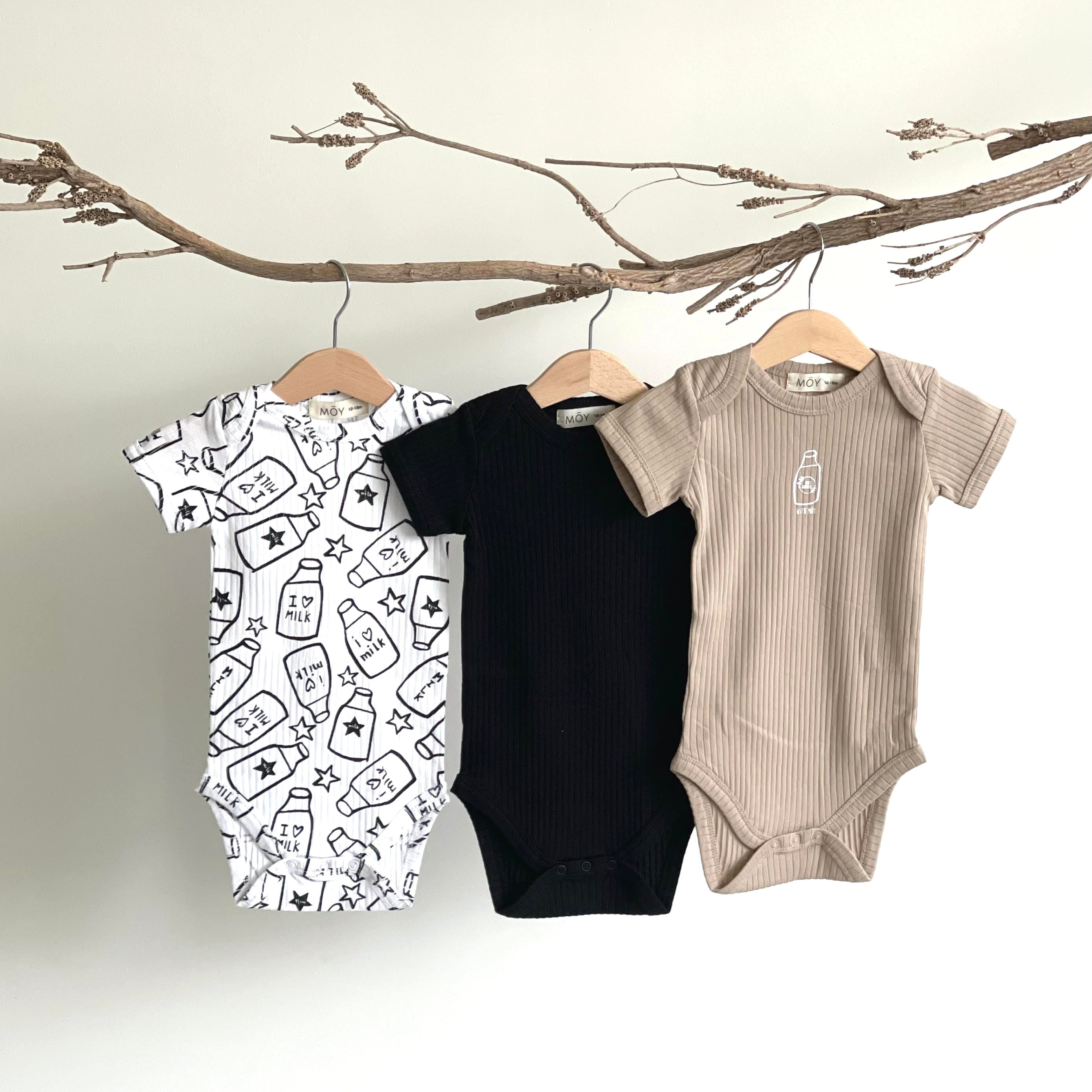 בגדי גוף עם שרוולים קצרים, עשויים בד כותנה אורגנית איכותי הסרוג בטקסטורת ריב. נוחים מאד ללבישה, שומרים על בטן הקטנטנים עטופה גם בזמן תנועה ובעלי תיקתקים במפשעה להחלפת חיתול פשוטה(שני בגדי גוף מודפסים ואחד חלק). הרכב בד: 100% כותנה אורגנית.