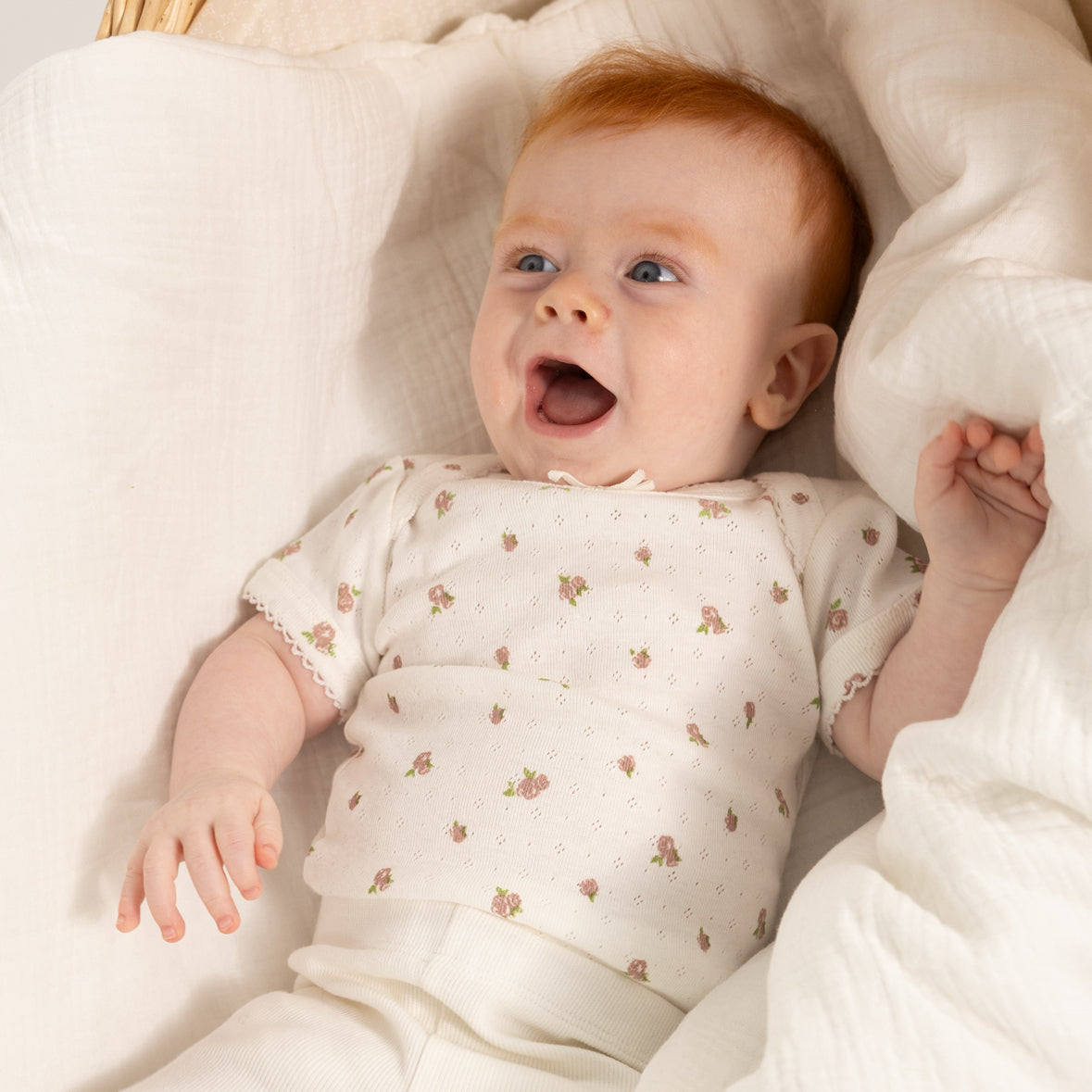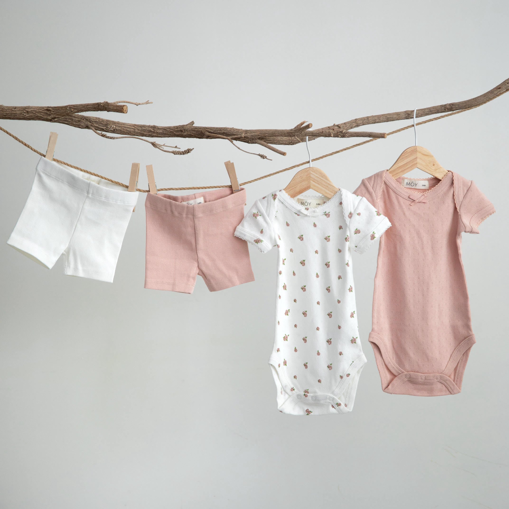 בגדי גוף עם שרוול קצר סרוגים בחירור פוינטל עדין.  נוחים מאד ללבישה, שומרים על בטן הקטנטים עטופה גם בזמן תנועה, ובעלי תיקתקים במפשעה להחלפת חיתול פשוטה. מפתח הצוואר מעטור ברקמת קרושה עדינה בצבע הבד ופפיון קטנטן.(בגי גוף אחד מודפס ואחד חלק(.