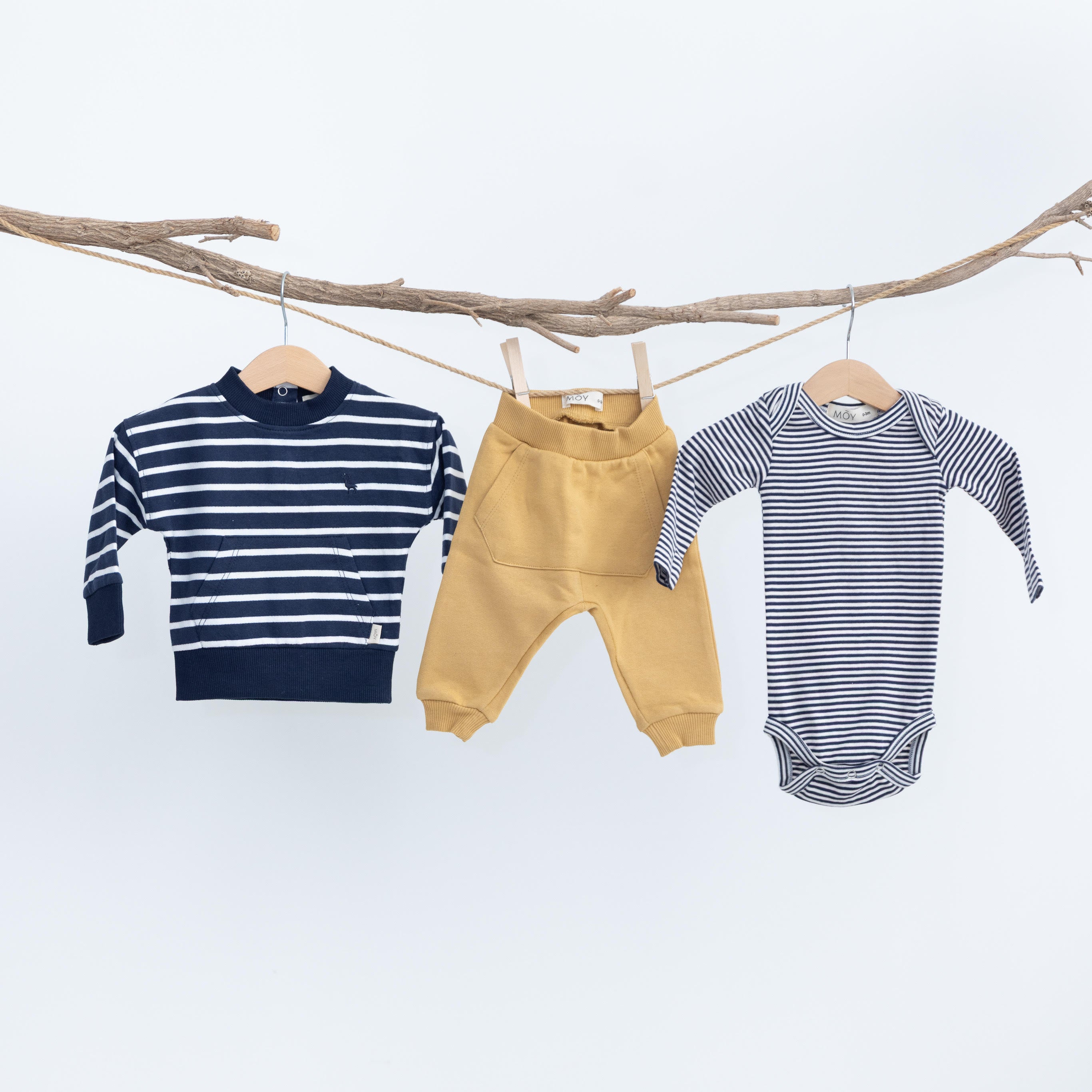 . בד בגד הגוף סרוג בפסים, קל להלבשה, נוח מאד ללבישה, בעל תיקתקים נסתרים במפשעה להחלפת חיתול נוחה הרכב בד: 100% כותנה אורגנית
