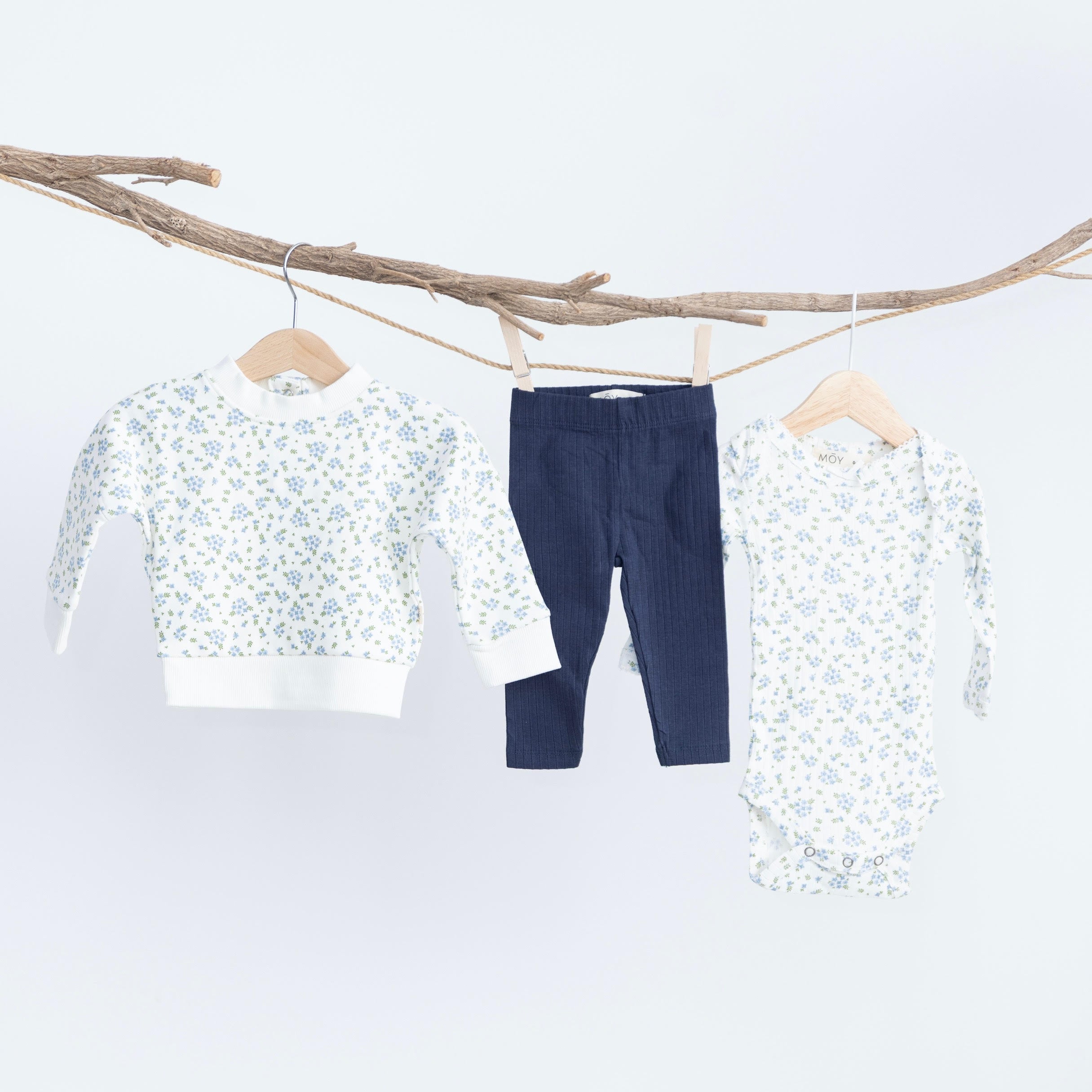 בד חמים, מגורד בחלקו הפנימי לנוחות וחימום.סיומות הסווטשרט עשויות מריב אלסטי ותיקתקים נסתרים בגב.  מודפס בפרחים קטנטנים בגוון תכלת.