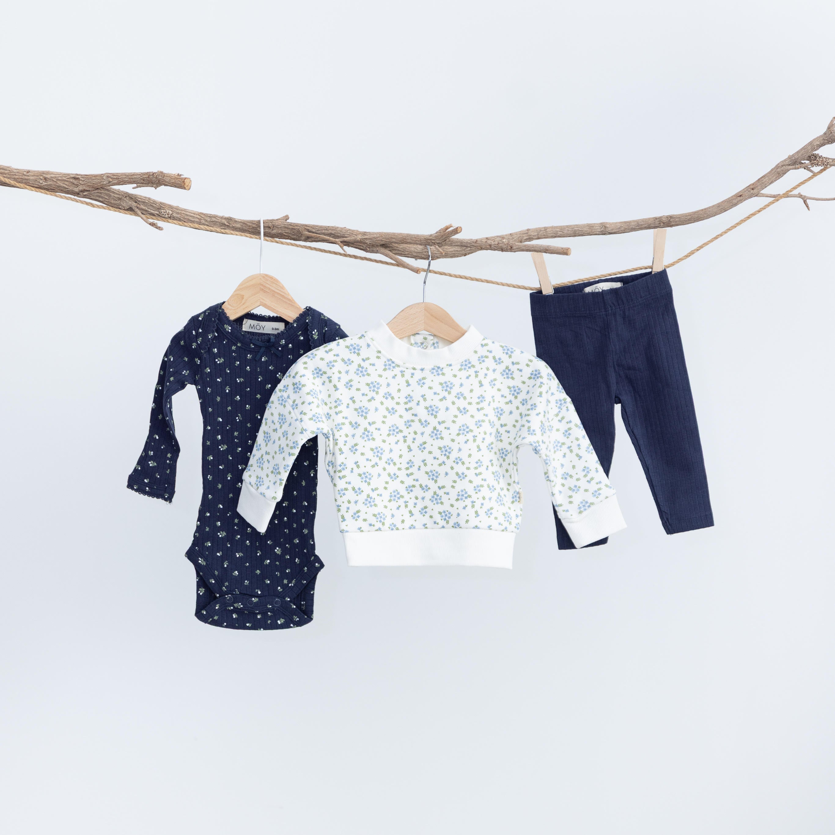 בד חמים, מגורד בחלקו הפנימי לנוחות וחימום.סיומות הסווטשרט עשויות מריב אלסטי ותיקתקים נסתרים בגב. מודפס בפרחים קטנטנים בגוון תכלת. הרכב בד: 70% כותנה אורגנית, 30% פוליאסטר