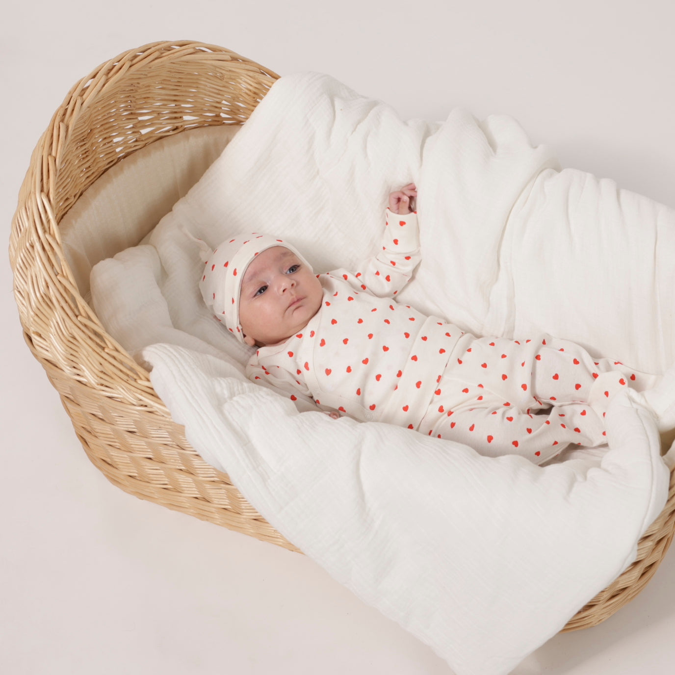 בד כותנה אורגני איכותי, מודפס בלבבות. גזרת בגד הגוף בנויה כמעטפת ומאפשרת הלבשה ללא מעבר הראש בבגד. בקצה השרוולים ישנם חפתים מתקפלים המשמשים ככפפות הגנה משריטות לפני גזירת ציפורניים ראשונית של התינוק. הרכב בד: 100% כותנה אורגנית