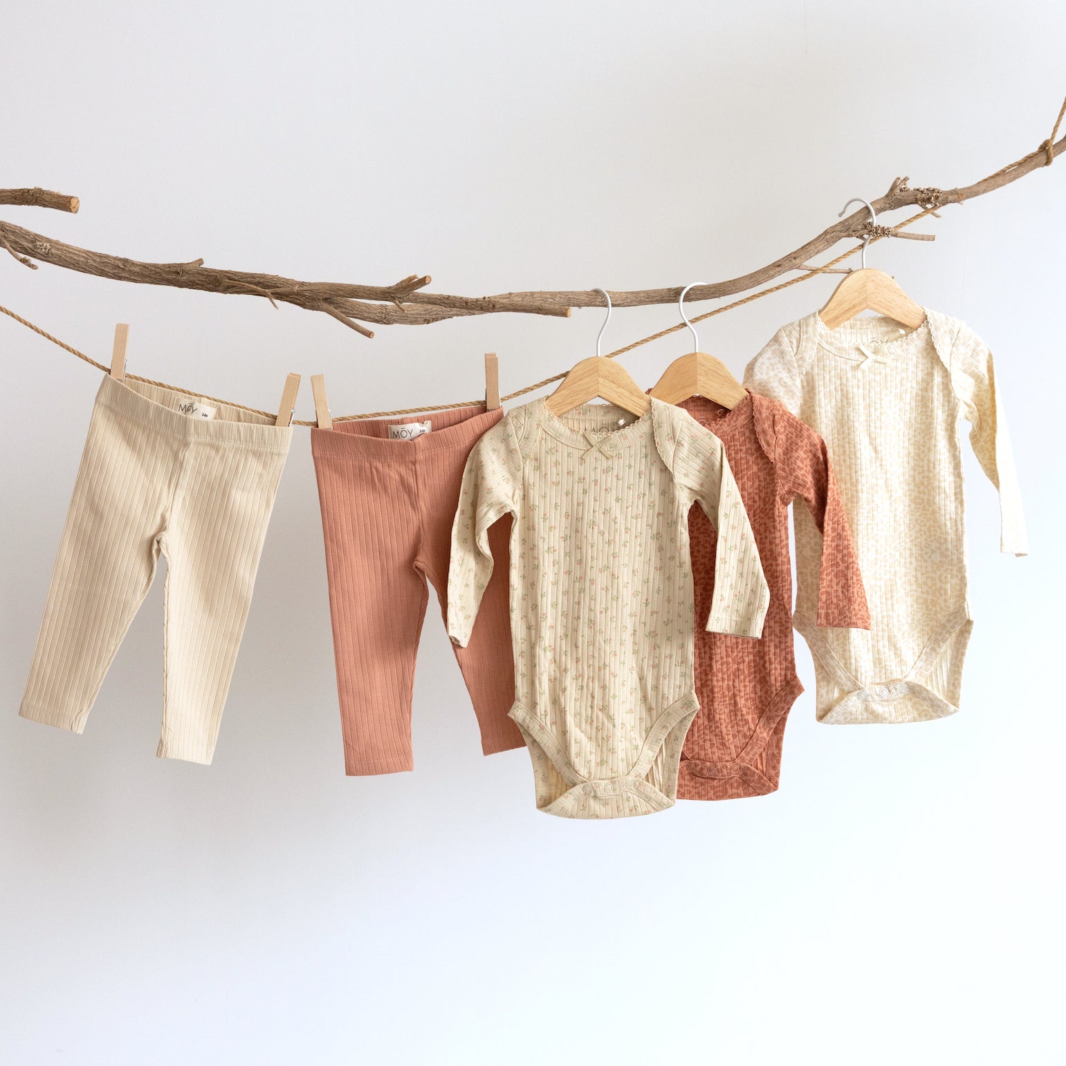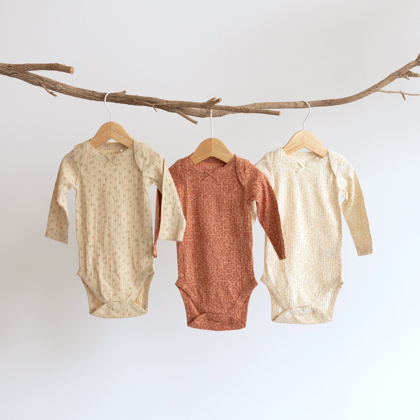 בגדי גוף בטקסטורת ריב רחב, נוחים מאד ללבישה, שומרים על בטן הקטנטים עטופה גם בזמן תנועה, ובעלי תיקתקים במפשעה להחלפת חיתול פשוטה. מפתח הצוואר מעטור ברקמת קרושה עדינה בצבע הבד ופפיון קטנטן.(שלושת בגדי הגוף מודפסים (.